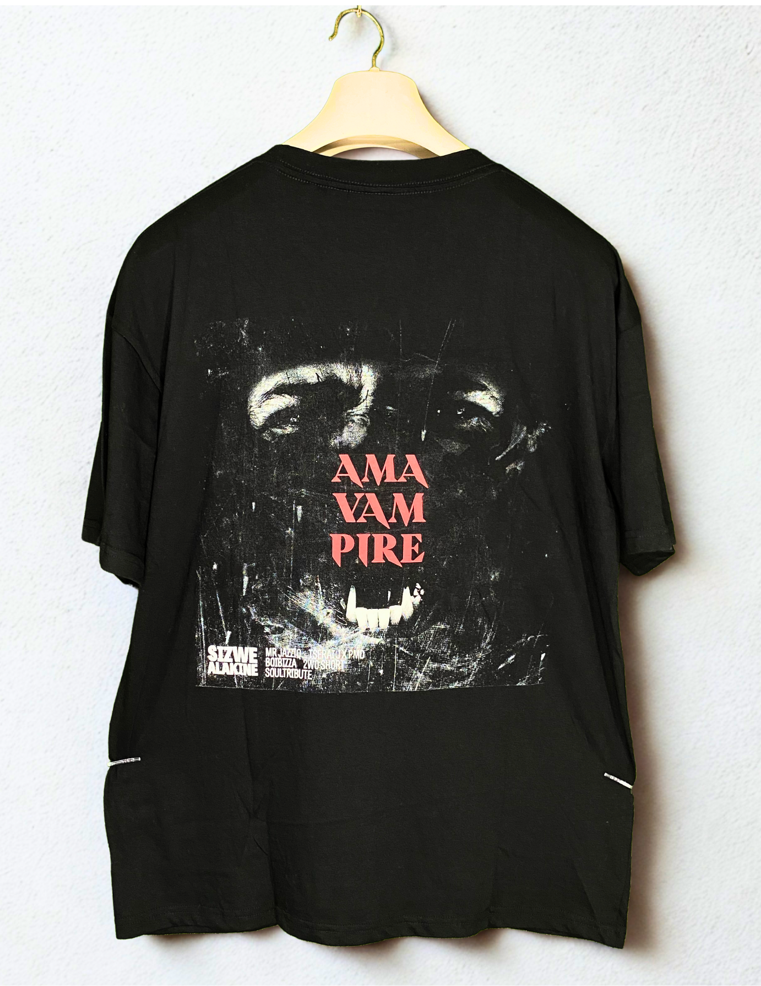 - Design: Vampire graphic print with bold red gothic text